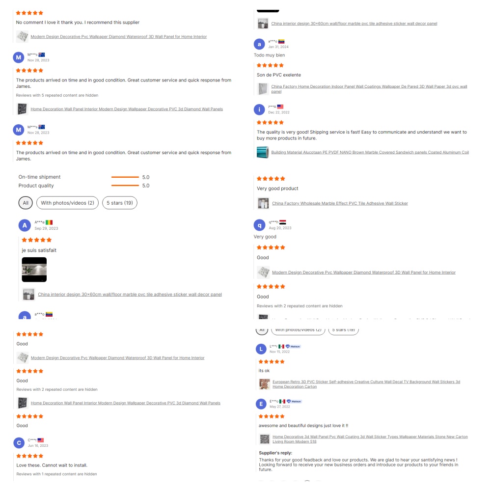 We have more than 10 production lines that can produce over 25 different HONGJINGU metal products, such as film-covered metal composite panels, aluminum honeycomb panels, PIR PU EPS sandwich panels, PE PVDF coating ACP, and printed embossed punched metal wall panels. Owens King specializes in home construction materials, including 3D PVC WPC UV wall panels, ceiling sheets, SPC LVT floors, MDF fiberboard, and carbon crystal plates. Because we are manufacturer, OEM is welcome.